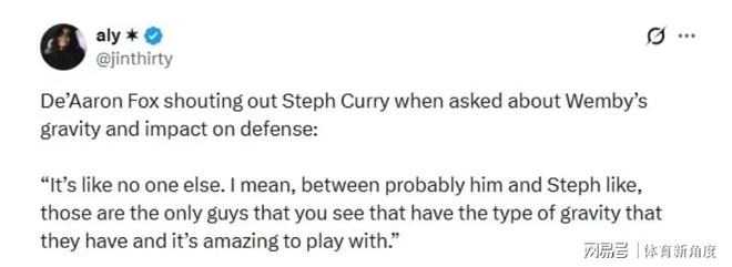 谈及文班亚马在赛场上的统治力时,福克斯表示:“在整个联盟里,我觉得大概只有他和库里具备如此强大的球场吸引力。能够和这样实力强劲的球员一同作战,真的是一种无与伦比的体验。不过要是和库里搭档的话,传球的时候可不能随心所欲地把球往天上抛,毕竟库里的打球风格和文班亚马还是有区别的。”