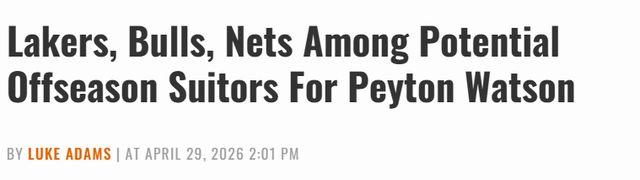 北京时间4月30日,据NBA记者杰克-费舍尔透露,湖人、公牛、篮网被视作今夏有薪资空间灵活性、有望全力争抢掘金受限制自由球员佩顿-沃特森的潜在追求者。