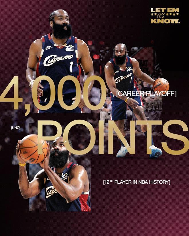 值得一提的是,哈登在此战还创下了神迹。数据显示,得到本场第19分之际,哈登的生涯季后赛总得分突破4000分!骑士官方显示:哈登也成为历史第12个做到这一点的球员。