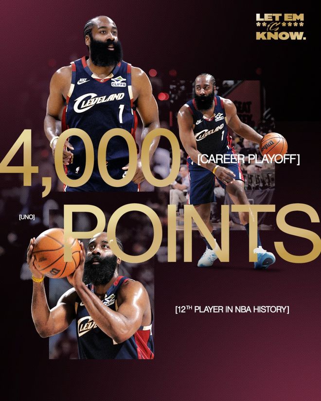 哈登突破抛投得分,个人季后赛生涯总得分突破4000分,成为NBA历史上第12位做到这一点的球员。