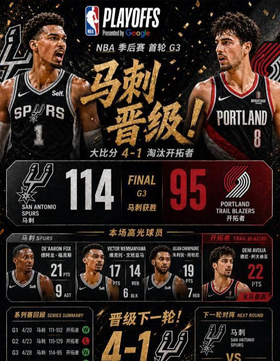 但马刺老练沉稳,面对压力毫不慌乱,关键阶段稳控节奏、精准执行战术,牢牢守住领先优势。终场哨响,马刺以114比95大胜对手,以总比分4比1干净利落地送走开拓者,昂首挺进西部半决赛,向着更高目标稳步前行。