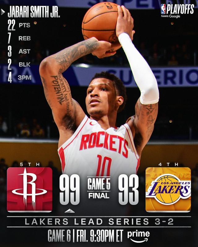 洛杉矶湖人队在首轮季后赛3-0领先休斯顿火箭队后,本有两次机会“打卡下班”直接晋级,但硬是让机会溜走了。就在今天,火箭队在客场顶住了湖人的猛攻,以99-93险胜,生生把系列赛拖回了休斯顿打G6。