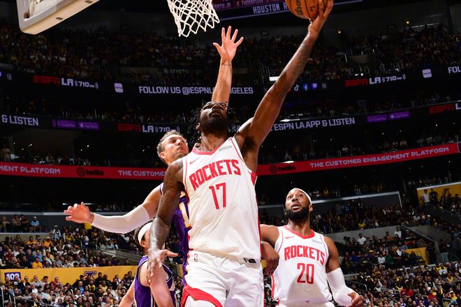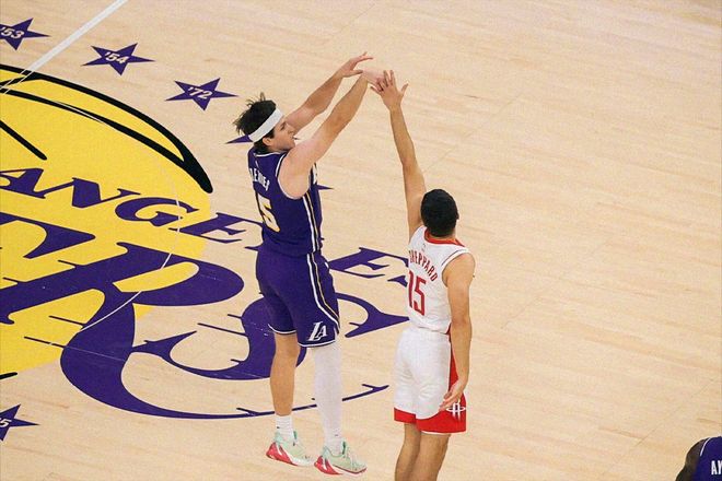 在0-3落后之后,火箭队已经连扳两场了。今天这场比赛,同样是生死战,赛前杜兰特因为脚踝伤势和骨挫伤继续缺席。湖人那边则迎来一个好消息,伤缺9场的里夫斯复出。从账面实力来看,湖人似乎是更强的一方。因为是伤愈复出,所以里夫斯从替补打起,这种情况下,两队依旧延续了上场比赛的首发阵容。