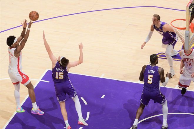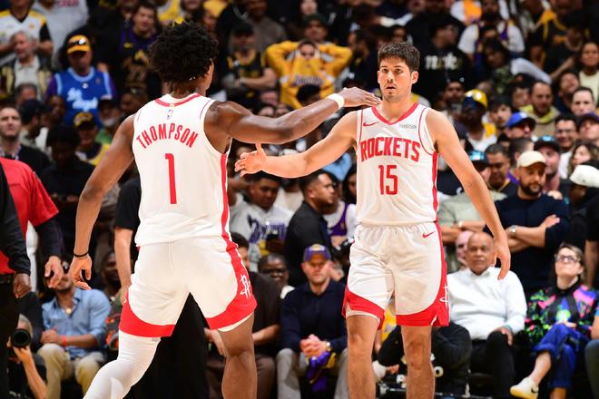 比赛刚开始,斯玛特的三分命中,帮助湖人队拔得头筹。而随着艾顿连续拼抢前场篮板得分,湖人很快取得了领先。而里夫斯上场后,效果也是尤为明显。三分犯规、连续助攻、超远三分,很快帮助湖人确立了两位数的领先优势。看起来,火箭队要在本场比赛结束本赛季了。但年轻人最突出的优点,就是年轻,体力充沛。很快火箭队迎来回暖,阿门的攻防转换、申京和伊森的突破,在首节结束的时候,帮助球队将分差缩小到7分。次节一上来,火箭队迎来了爆发。而一切的开始,就是从湖人旧将芬尼·史密斯投进个人系列赛第一记三分开始。
