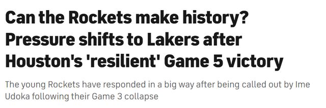 乌度卡的这番敲打显然起到了作用。火箭99-93拿下G5的胜利,将系列赛大比分追到2-3,局势风向正倒向休斯顿。就在短短几天前,火箭还濒临赛季出局,如今压力彻底转回湖人身上。