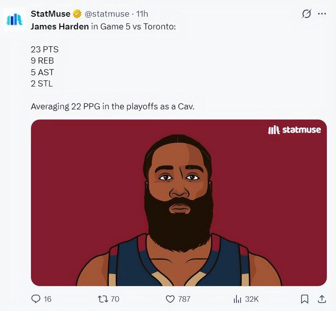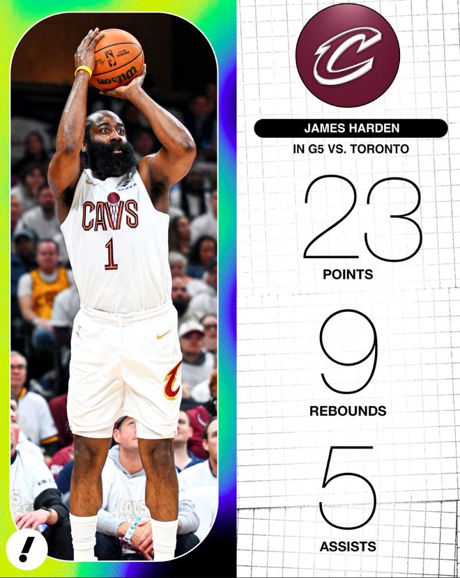 哈登来到骑士队后季后赛场均35.6分钟,拿到22分6.2助攻4.4篮板2抢断0.6盖帽,命中率48.6%,三分命中率41%,场均3.2个三分球。