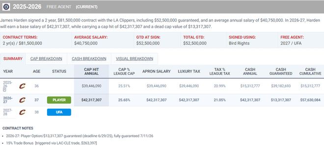 哈登下赛季合同是4231万,但保障部分只有1330万,他有意跳出合同跟骑士重签一份两年7500万的长约,哈登这个表现绝对配得上这样额度的合同,均薪才3750万远低于顶薪。