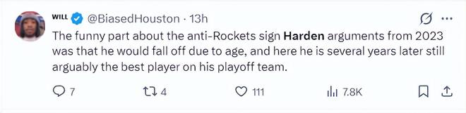 休媒Will也被哈登打服,他表示:关于2023年有人反对哈登回到休斯顿的观点,他的年龄过大无法再季后赛的舞台延续表现,但几年过去了,他依旧是他所在球队季后赛最出色的那个。