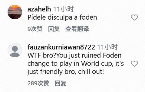 “搞什么。你刚毁掉了福登踢世界杯的机会,这只是友谊赛,冷静!(注:他误打成了‘改变’change,赛后门将特拉福德称,福登没有大问题。)”