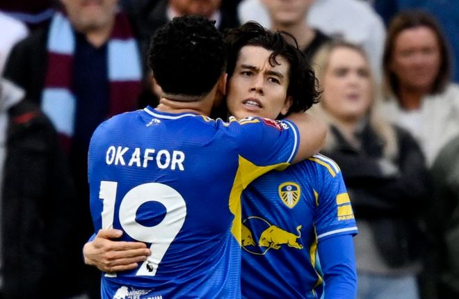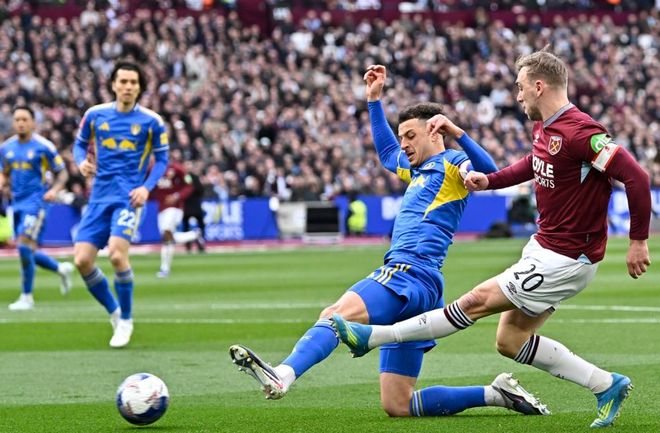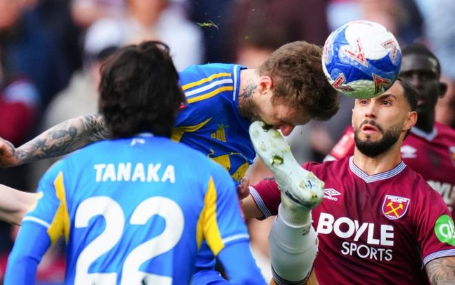 足总杯1/4决赛最后一场对决在西汉姆联和利兹联之间展开。这场比赛开场不久奥卡福尔就获得机会,他在禁区内推射远角,结果被门将神扑化解。随后,鲍恩在禁区左侧的低射也被门将扑出。第26分钟,利兹联进球了!奥卡福尔把球传给禁区内的田中碧。田中碧得球之后,扣球骗过身前的防守球员,随即起脚射门。皮球被挡了一下折射入网!第40分钟,卢卡斯-恩梅加犯规,被出示黄牌。半场结束,利兹联1球领先。