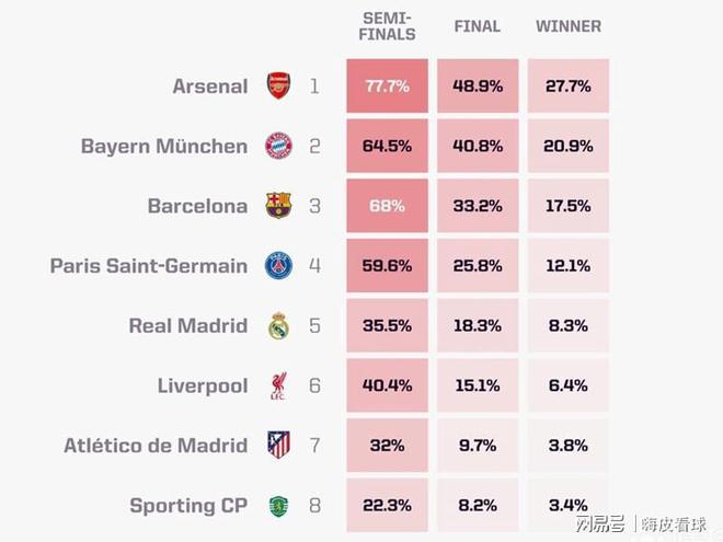 同时,阿森纳和拜仁慕尼黑,都有四成以上的机会能够晋级决赛,卫冕冠军巴黎圣日耳曼,只有25%,似乎有点偏少,也反映出这个半区实力强劲。至于最后的冠军,阿森纳比拜仁要稍高一些,阿尔特塔的球队,难道可以获得队史首座欧冠奖杯?
