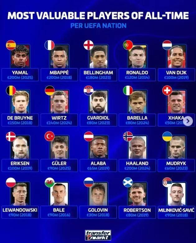 而在欧洲各家国家队球员历史身价排行榜中,西班牙国家队、法国、挪威均是2026年度身价2亿球员领跑,英格兰身价最高的贝林厄姆,他目前身价为1.8亿欧,葡萄牙则是2014年时期的C罗,当时他的身价为1.2亿欧。此外,荷兰的范戴克在2019年以1亿欧领跑,比利时则以2018年时身价高达1.5亿欧德布劳内领衔,德国队历史最高身价则是由2024年的维尔茨保持,当时他的身价高达1.4亿欧,丹麦的记录则由埃里克森保持,当时他的身价为1亿欧。值得关注的是,除了上述国家队外,其他国家队历史最高身价均未超过1亿欧。