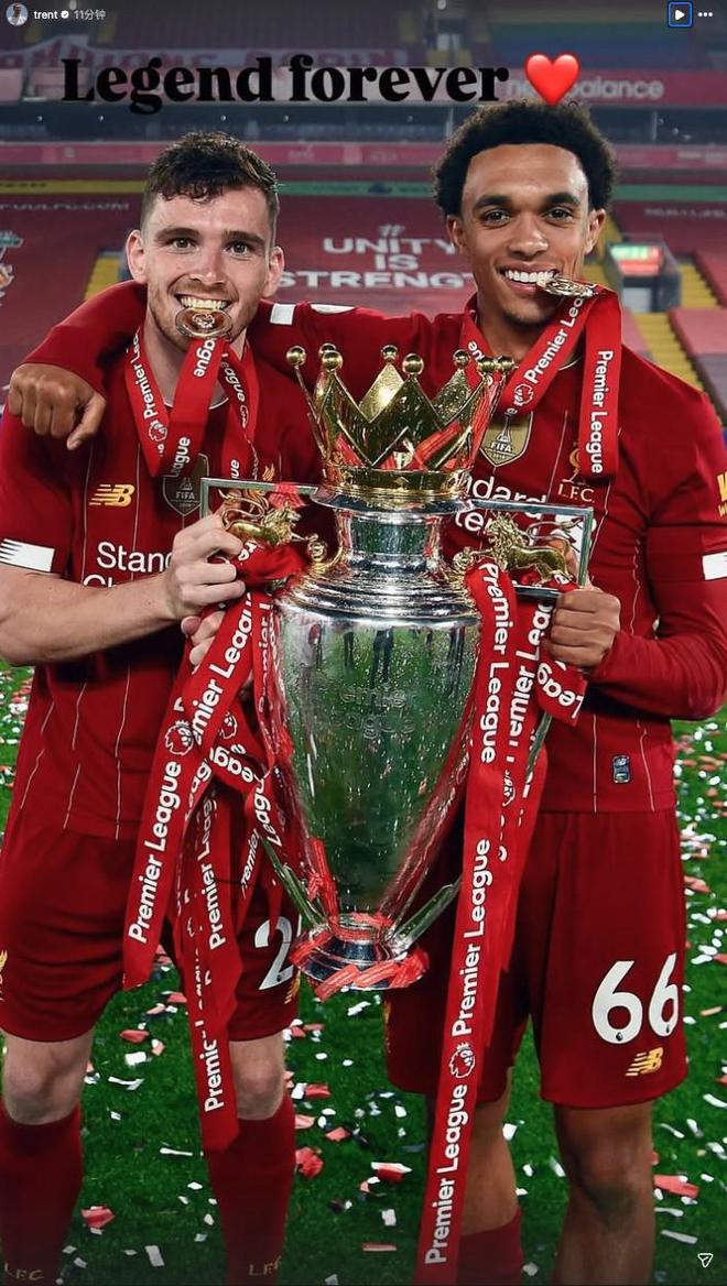 去年夏天离开利物浦的阿诺德在社交媒体晒出他和罗伯逊在2019-20赛季手捧英超冠军奖杯的合照,并配文:“永远的传奇❤️”
