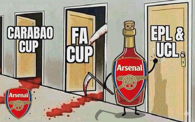 最损的一条评论在底部——"为什么要跟阿森纳球迷吵架,等着就行。"下面有人接梗:Piri Piri辣酱又立功了(指阿森纳被葡萄牙体育淘汰的欧联梗)。整个帖子200多条回复,奖杯还没摸到,精神胜利法先用上了。