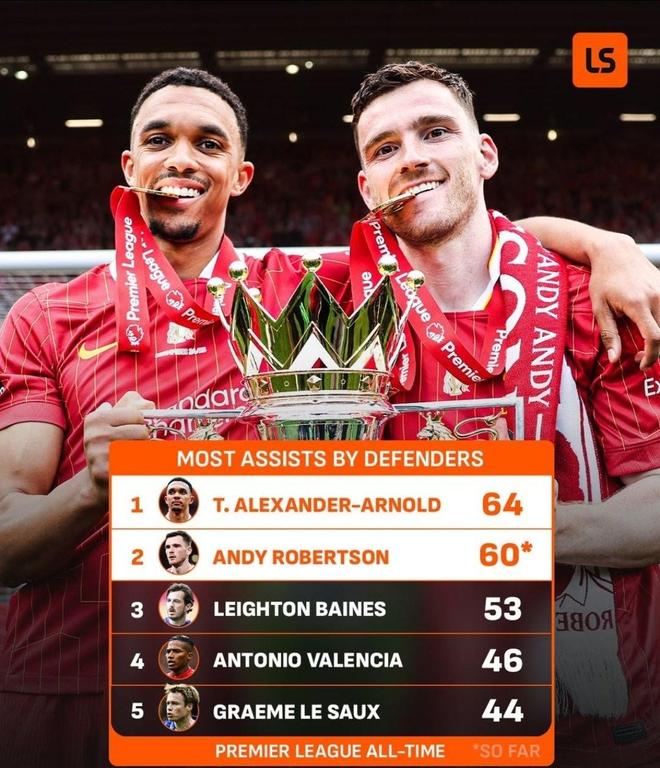 在利物浦官方宣布罗伯逊将在赛季结束后离队后,海外媒体统计了英超历史后卫助攻,其中利物浦后卫阿诺德64次第一,罗伯逊60次第二。