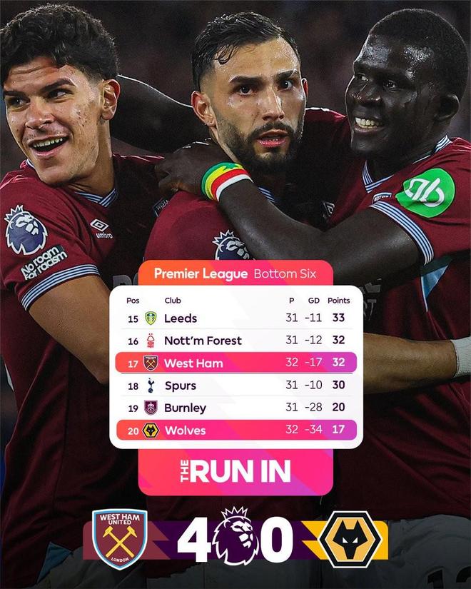 英超第32轮首场比赛中,西汉姆联主场4-0大胜副班长狼队,以32分升至联赛第17位,暂时跳出降级区。