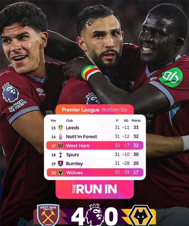 北京时间4月11日,英超第32轮一场备受关注的“保级大战”打响。最终西汉姆联在主场4-0大胜狼队,主场5轮不败后,成功逃出降级区。而热刺也在本轮未赛情况下,暂时跌入英超降级区。