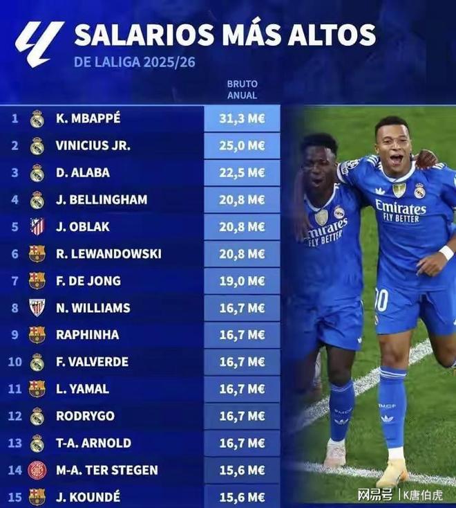 在西甲联赛中,姆巴佩以3130万欧元的税前年薪位列第一,比收入第二的维尼修斯要高出足足500万之多,可以说这样的顶薪既让他收获满满,也让他饱受争议。毕竟自来到西甲后,他并未表现出独一档的存在,反而因为他的加盟而让皇马整个团队都在为他买单。球迷们反复唠叨的:他走了,巴黎夺冠了;他来了,皇马又四大皆空。