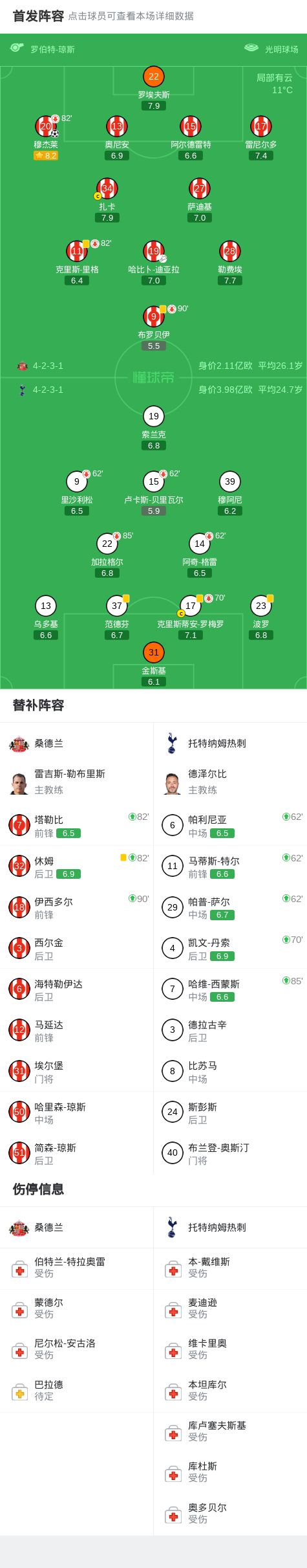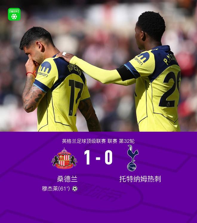 北京时间4月12日英格兰足球顶级联赛第32轮,桑德兰主场对阵托特纳姆热刺。比赛中,穆杰莱一条龙破门,随后罗梅罗与金斯基相撞后伤退,雪上加霜。最终比分桑德兰 1-0 热刺。