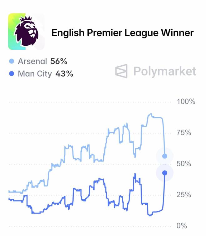 赛后根据数据机构Polymarket Sports的预测,阿森纳的英超夺冠概率已经从巅峰的91%降低至56%,而曼城的夺冠概率则升至43%。