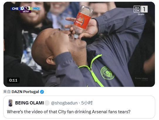 这一建议的起因是,在曼城客场大胜切尔西的比赛中,有球迷庆祝时使用了一个阿森纳品牌的瓶子,这段视频在网上疯传。