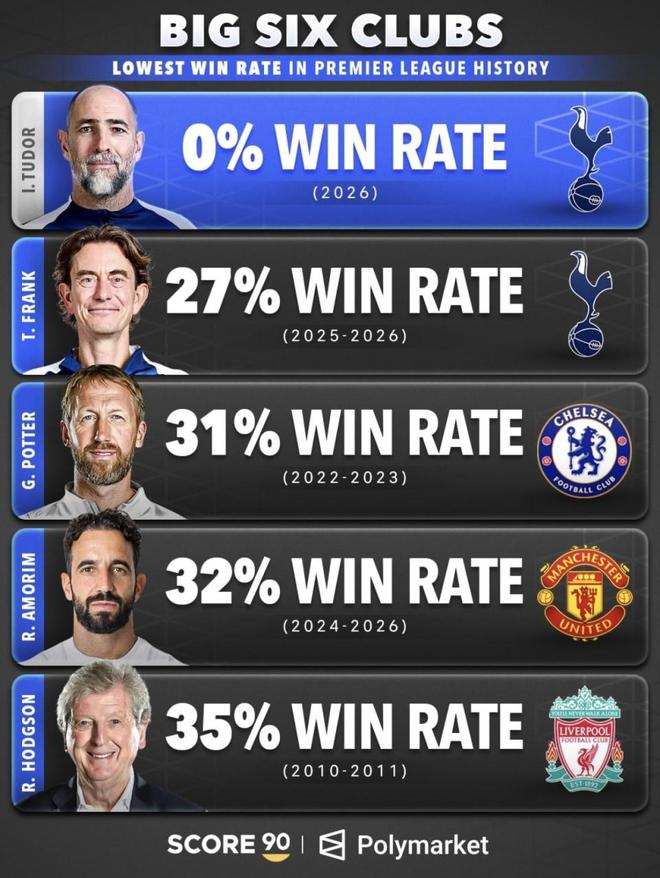 在这份英超传统六强历史最低胜率榜单里,最刺眼的其实不是谁排第一,而是热刺竟然一下占了两席。图多尔那个“0%”的胜率看上去确实最夸张,但这数字很大程度上是极端样本折腾出来的。他在热刺满打满算只待了44天,带队踢了7场球就卷铺盖走人了。当时热刺已经跌到了联赛第17名,离降级区就差1分。单看百分比,图多尔确实最难看,但要论谁的问题更严重,还真不能只盯着这一个数字。