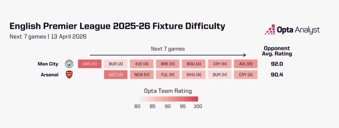 但从更广视角审视双方剩余赛程,阿森纳仍占优势。根据Opta实力评分,阿森纳剩余对手的平均评分为90.4,而曼城对手为92.0。相比联赛其他球队,阿森纳剩余赛程难度位列第四轻松。只要能在伊蒂哈德避免失利,主动权仍在自己手中,尤其是他们还剩三个主场。