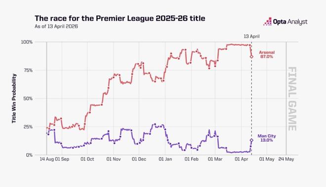 据Opta数据机构报道,阿森纳虽遭遇争冠危机,但剩余赛程占优、强强对话记录出色、防守数据冠绝英超等因素,让模型仍将其视为夺冠头号热门,夺冠概率高达87%。