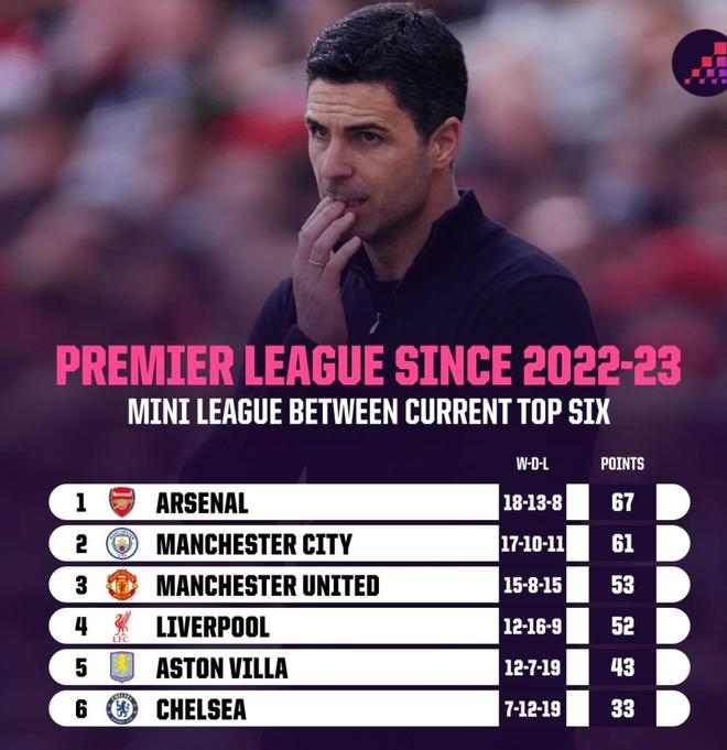 更重要的是,阿尔特塔治下的阿森纳在强强对话中的整体战绩令人印象深刻。过去三个半赛季,在目前排名前六球队的相互交锋中,阿森纳输球最少(39场仅8负),积分最高。如果说存在某种规律,那就是阿森纳往往在预期必胜的比赛中丢分,而非在对阵直接竞争对手时失手。