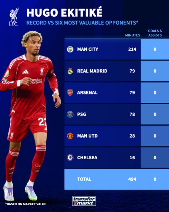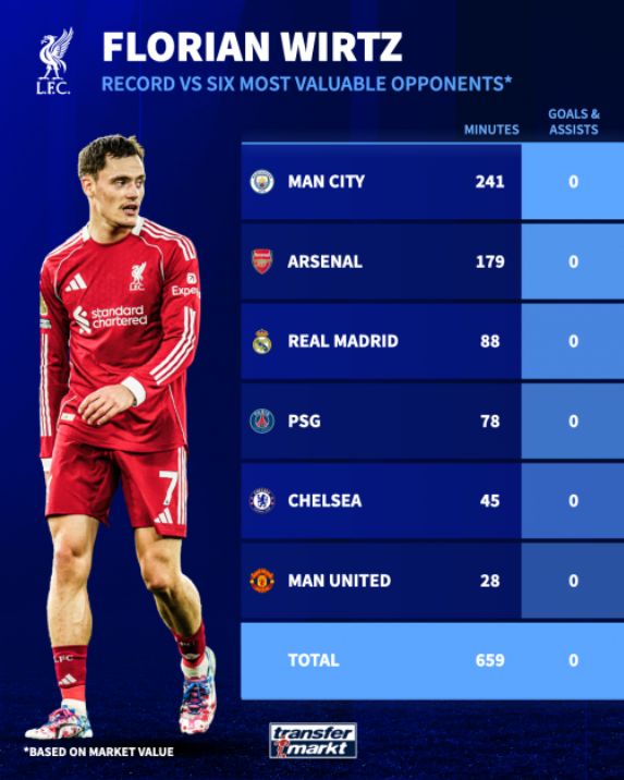 令人难以置信的是,维尔茨和埃基蒂克在面对这六支球队时,两人合计出场1153分钟,竟然没有贡献任何进球或助攻。