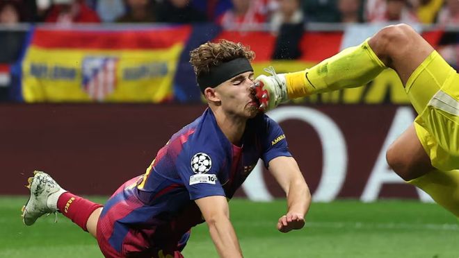 当时亚马尔送出传中,费尔明反应极快冲上去头球攻门,但在随后的拼抢中与出击的穆索发生了剧烈碰撞。
