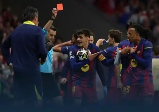 最终的结果大家都知道了:埃里克·加西亚直接被红牌罚下。在比赛接近尾声时少一人作战,这让巴萨原本就艰难的处境彻底无解,无论后续怎么努力,也无法挽回出局的命运。