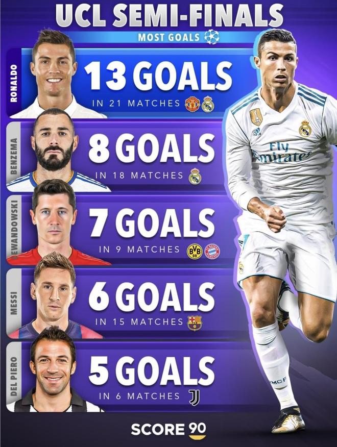 再往后看,劳尔、莱万、因扎吉、舍甫琴科、本泽马、贝尔、拉莫斯等人,也各自证明了不同类型的“含金量”。劳尔的厉害之处在于他的时代地位,他在1/4决赛和决赛榜单都能名列前茅,证明他不是只能踢顺风局,而是真能在最后阶段一锤定音。莱万虽然主要出现在半决赛榜单里,但9场打进7球,效率极高,特别是当年半决赛对皇马的4球表演,至今仍是欧冠半决赛最经典的个人得分纪录。因扎吉和舍甫琴科则是标准的大场面射手,进榜次数可能不如前两位,但只要上了榜,含金量就极高。