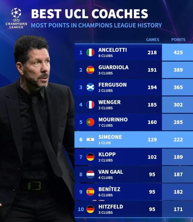 北京时间4月15日,在马德里竞技以两回合总比分3-2淘汰巴塞罗那,时隔9年再次闯入欧冠四强之后,德转统计出了欧冠联赛历史拿分最多的主教练,安切洛蒂以执教8家俱乐部拿到425分高居第一,西蒙尼仅执教马竞一支球队拿到222分位列第6。