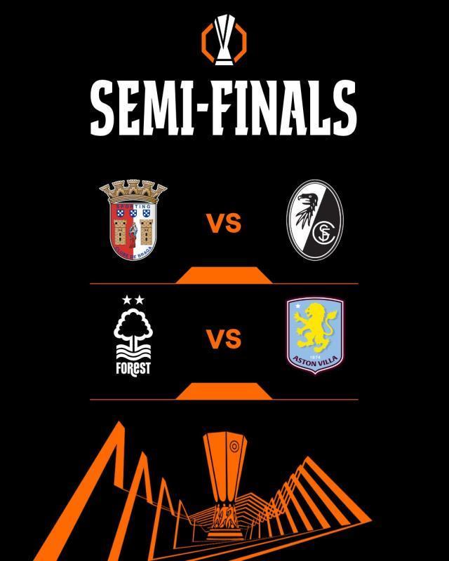 欧联杯半决赛对阵:维拉vs森林,布拉加vs弗赖堡