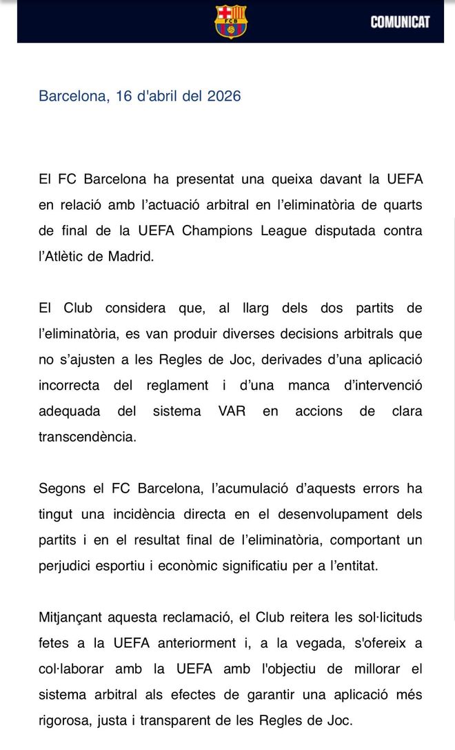 欧冠八强战刚结束,巴萨官方突然向欧足联提交正式投诉。矛头直指对阵马竞两回合的裁判执法——这不是普通的赛后抱怨,而是一次有备而来的规则博弈。
