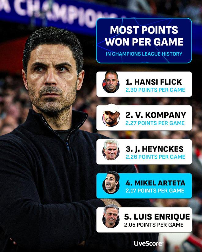 欧冠1/4决赛首回合3-0皇马后,阿尔特塔的欧冠场均积分冲到历史第四。听起来像封神现场?先别急着吹。