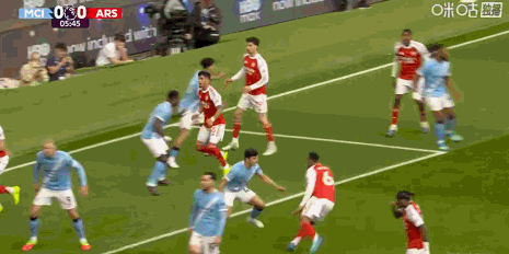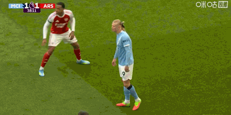 第39分钟,贴身肉搏,哈兰德和加布里埃尔纠缠在一起