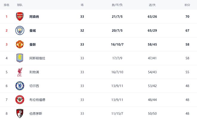 在积分榜上,阿森纳虽然输球,依然占据榜首位置,总积分是70分。曼城越追越近,总积分达到67分,只比阿森纳少3分。而且,曼城还少赛一场。没想到争冠格局会变得如此激烈。阿森纳此前积累的优势被不断消耗。曼联以58分排名第3。阿斯顿维拉赢球之后,也是58分,排名第4。利物浦以55分排名第5。切尔西48分排名第6。至于热刺,只拿到31分,排名倒数第3,深陷降级区。