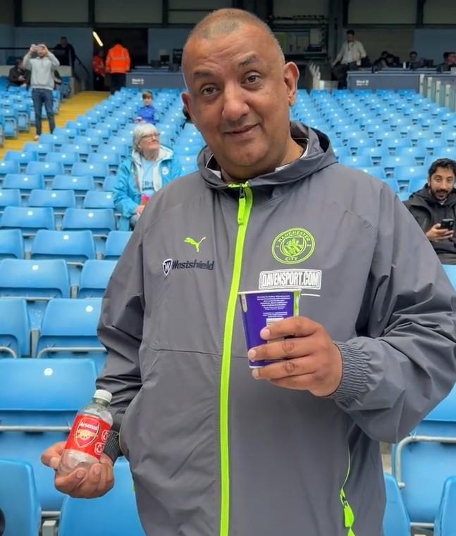 根据博主 在社交媒体发布的视频,一夜爆红的曼城球迷“水瓶哥”又带着印有阿森纳队徽的水瓶来现场看球了。