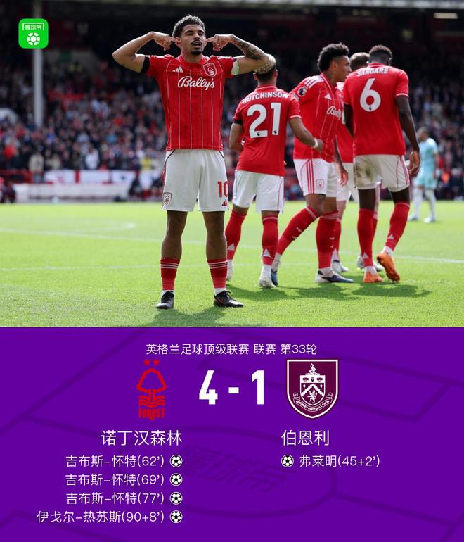北京时间4月19日21:00,英超第33轮,诺丁汉森林主场对阵伯恩利。上半场,沃德-普劳斯任意球攻门被扑出,穆里略伤退,半场补时阶段,弗莱明推射破门。下半场,吉布斯-怀特15分钟连入3球上演帽子戏法,吉布斯-怀特是森林队史第3位在英超戴帽的球员,伊戈尔-热苏斯补时阶段锦上添花,最终,诺丁汉森林4-1逆转伯恩利,33轮过后高出降级区5分。