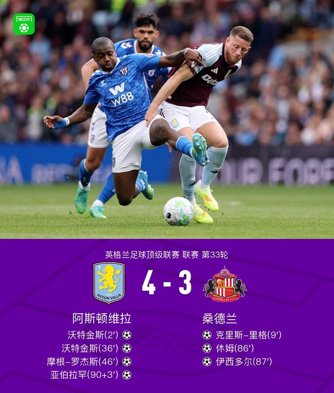 北京时间4月19日英格兰足球顶级联赛第33轮,阿斯顿维拉主场对阵桑德兰。沃特金斯2射1传,摩根-罗杰斯、亚伯拉罕破门。克里斯-里格、休姆、伊西多尔分别建功。最终比分阿斯顿维拉4-3桑德兰。