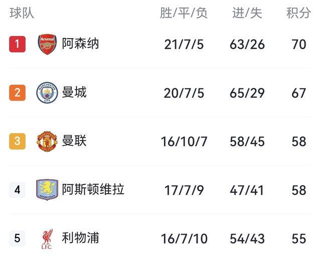 曼城在少赛1轮的情况下,32轮比赛积67分,与33轮积70分的阿森纳只相差3分了,英超争冠悬念拉满!