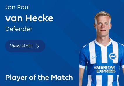 英超第34轮,布莱顿主场3-0大胜切尔西,布莱顿中卫范赫克当选全场最佳球员。