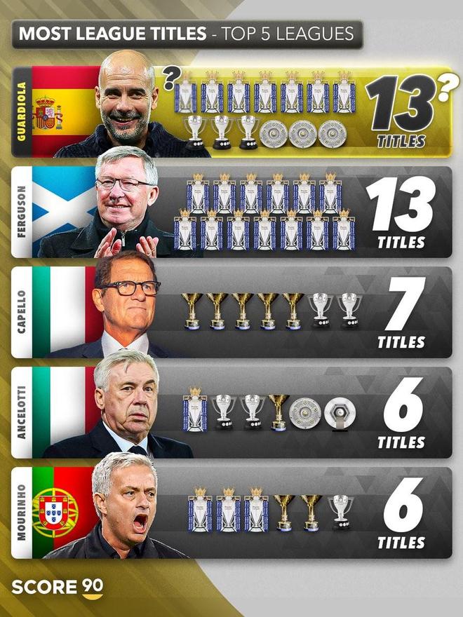 北京时间4月20日,Score 90统计出了1990年至今欧洲五大联赛主教练夺冠榜,曼联的传奇主帅弗格森以13次联赛冠军排名第一,正率领曼城冲击本赛季英超冠军的瓜迪奥拉12次排名第二。