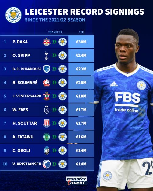 先说明一点,跟同期别的英超球队比,这些转会费其实不算特别高,问题是莱斯特城花出去的这些钱,全打了水漂。比如2021年花三千万从萨尔茨堡红牛买的达卡,始终没踢出来。虽然他一直没能稳定输出大家期待的那种进球效率,可五年过去了,人居然还留在队里。