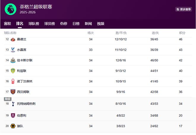 英超历史上,仅有三支球队拿到40分及以上却依旧降级:1996-97赛季桑德兰、1997-98赛季博尔顿同积40分降级,2002-03赛季西汉姆联拿到42分仍遗憾降级。